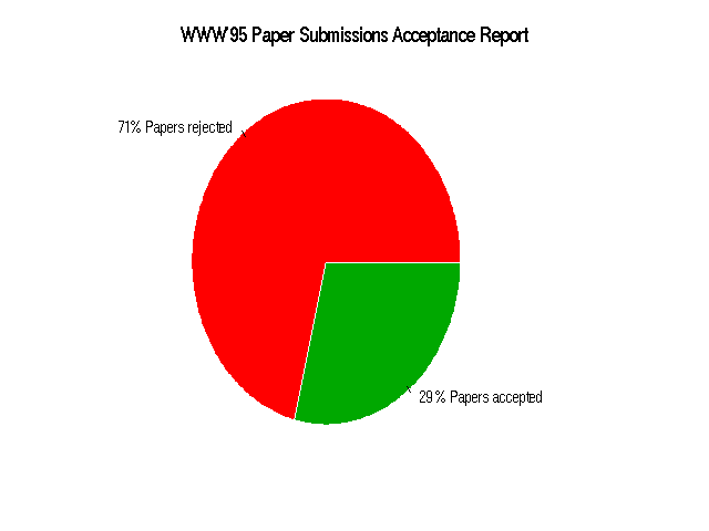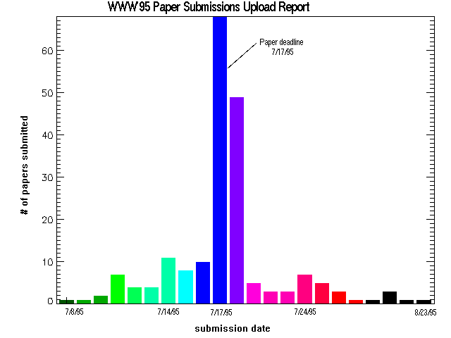 The submission deadline was July 17, 1995. However, many papers were submitted late; in fact, nearly 45% of the papers were late. As many more papers are being submitted to each WWW Conference, there will be a need for a stricter policy on late papers with an absolute deadline where only exempted papers are permitted a late submission. Further analysis of the data shows that a greater percentage of the earlier submitted papers were accepted (46%) as opposed to the late papers (18%) since the reviewers had more time to review them.