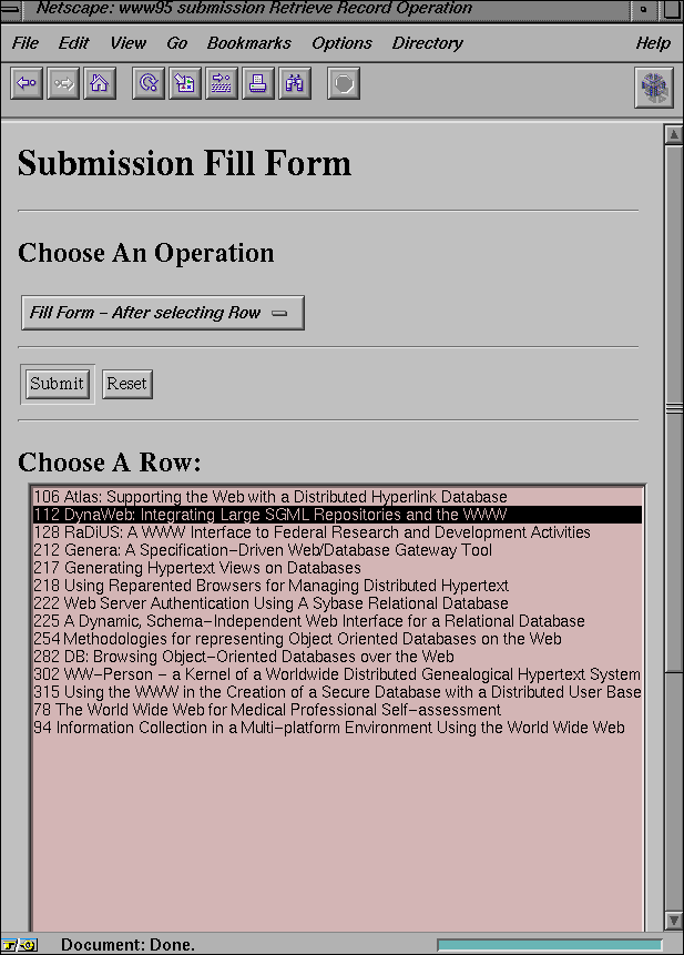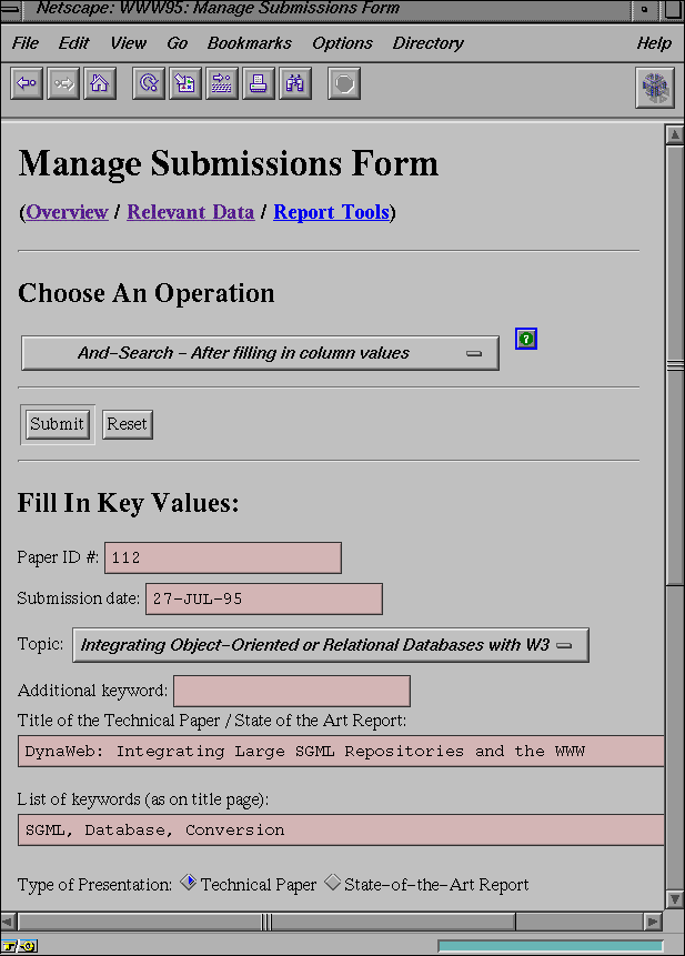 Each form will have all or a subset of these seven operations. A sample database query form is illustrated in Figure 1 with the corresponding HTML equivalent shown in Figure 2. Hidden within the HTML form are fields specifying what database is used (Oracle in this case, where Sybase is also supported), what is the form name, primary table, and other information to identify the database table. The column names of the database table are inserted into the form with the NAME tag using the syntax column name.data type.database tablename[.optional flags]. For example, the submission_id column name, which follows the "Paper ID #" text in the form, is a character type designated with the "c" data type from the submissions database table, and the flags "pm" indicate that it is a primary key (p) of the table and the value must be filled-in when modifying the database (m). This form is used as a template by the CGI program, which fills in the appropriate values depending on the HTML context. In the case of an INPUT element, the VALUE="" attribute is inserted into the form, and the value of the database replaces whatever text (if any) is between the double quotes. For a SELECT element such as the decision column at the bottom of the form, the SELECTED attribute is inserted into the OPTION element that matches the value in the database.