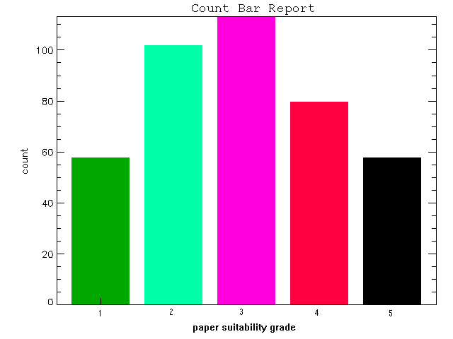 The grading of all the papers was fair with the expected bell-shaped curve with many papers receiving an average score (3) and fewer papers having a poor (1) or outstanding (5) score.