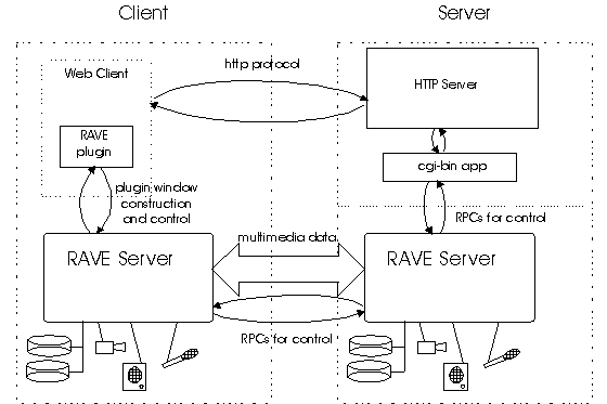The RAVE system is intended to support wide classes of multimedia applications integrated into the existing Web architecture. The prototype client-side system uses a Netscape Navigator Web client as its host. We felt that simple real-time applications should be constructable using HTML (with extensions where required) without additional cgi-bin server-side code. We also wanted flexibility in the distribution models, for example, unicast and broadcast, shared and exclusive-access data sources, flexibility and transparency for stored vs. live-data feeds, and recording and playback symmetry. Finally, we wanted an extensible system into which new real-time services could be incorporated easily.