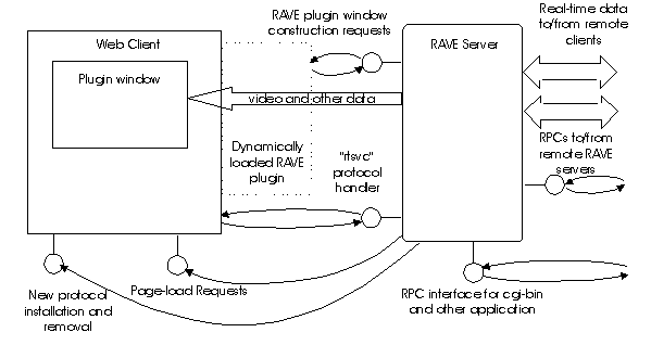 The architecture includes a RAVE server application and a RAVE client-helper library which provides plugin windows and external pop-up windows to Web clients. Figure 1 is an overview of the functional components, their interactions, and the main data paths among them. The data and control communications may be via network connections (multimedia data), explicit function calls (a Web client communicating with dynamically loaded plugin code), or local- or remote-procedure calls (RPCs).