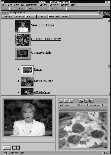 In the lower frames of Figure 3, the right-hand playback widget is normally used as a full video player while the left-hand widget displays still-frames from the video (for example, to display a still-frame of a viewgraph in a technical talk). More sophisticated behavior like a text and image-search facility would require the use of a cgi-bin application or Java applet but considerable sophistication can be accomplished with client-side techniques alone.