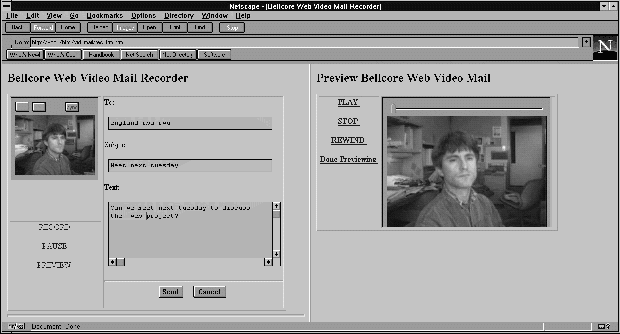 An interface to a video archive is one of the simplest applications that can be built with the RAVE system. It is built entirely using static HTML with no cgi-bin server support. A window-dump of the prototype is shown in Figure 3. The top frame is an HTML page which has been built automatically from our video-tag database. This page contains representative still-frames and the accompanying text-tags. Below this are two video windows connected to a separate remote video-server service (specifically AviFilePushSources in the terminology of Table 1). The images are hotlinked to the left window and the text to the right window. Clicking on the text or image video player seeks the appropriate to the applicable point in the video sequence.