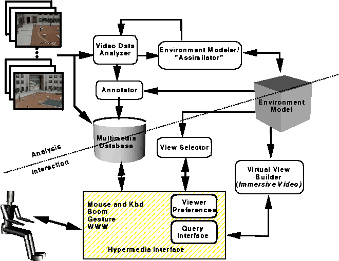 It is the paradigm of MPI Video, described in more detail in Section 2, which demands and in fact enables this level of interaction. More than just a collection of video streams, the MPI Video environment is a heterogeneous, distributed information structure. The primary source of information is a number of live video streams acquired from a set of cameras covering a closed environment such as a football game. This environment has a static component consisting of a model of the environment which resides on a server. The server also contains a library of possible dynamic objects that can appear in the environment. Multiple sensors capture the event and the system dynamically reconstructs a sequence of camera-independent three-dimensional scenes from the video streams using computer vision techniques[7]. In MPI Video the role of the user is to view and navigate in this world as the real-life event unfolds. While remaining in this world, the user may also request additional information on any static or dynamic object. Secondary information resources such as hyper-linked HTML documents, databases of static images, and ftp sites of reference archives are available to the system and may need to be accessed either to initiate a user query or as the result of a query.
