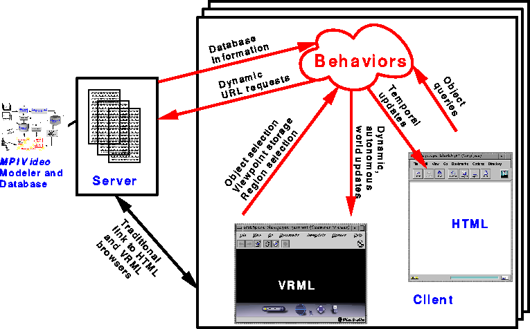 Figure 5 shows a sample session at a client (user) site which uses the VRML browser, the HTML browser, and other applications[8]. The information is presented using the VRML browser, with interesting dynamic and static portions of the scene hyper-linked to either related VRML worlds or HTML query forms.
