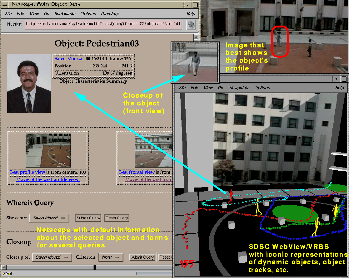For the session shown in Figure 5, we used a campus courtyard with pedestrians covered with six video-resolution cameras. The video sequence was digitized at 10 frames per second and processed by the MPI Video modeling system. (A Quicktime video segment is available). The dynamic objects in the environment were detected and tracked to create a database of object ids, object locations, video clips, and related information built using flat files and dbm files.