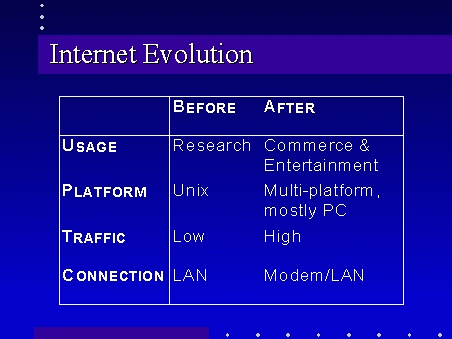 This table shows how the Internet has evolved over the last few years. What was once the domain of relatively few researchers has become the domain of the masses, who are interested in commercial and entertainment applications. Where Lan-connected Unix users were once the dominant group on the Internet, now more than half the connections are from PC’s, and/or via modem. Internet traffic has skyrocketed as the size of the community has increased.