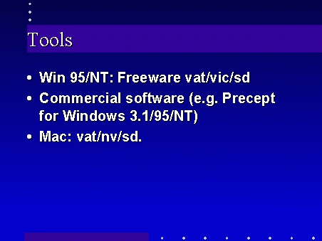 Freeware ports of the Unix tools to Windows NT and 95 are nearly completed. Versions of sd and sdr are available. Vat and vic can receive audio and video (respectively) and will soon be able to send also. There is no wb (whiteboard) or mrouted (tunneling) yet. See http://www.research.microsoft.com/research/Barc/Telepresence/mbone.html