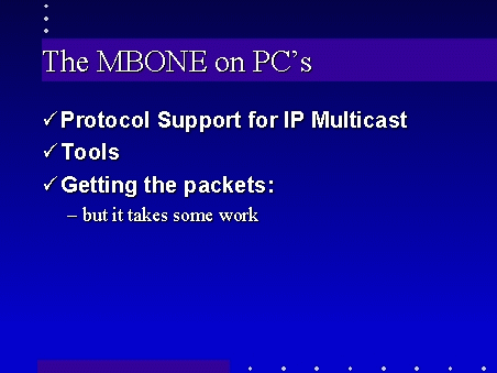 So the Protocol support and tools are in place for PC’s to join the MBONE. Setting up your network to receive/send the packets may take some work, but its not impossible (and its not just a problem for PC’s).
