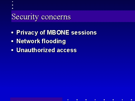 Security issues related to the MBONE fall under three broad categories: privacy, net flooding, and unauthorized access.