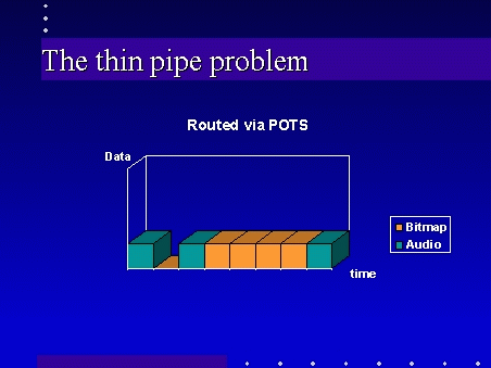 Now suppose that one of the conference participants is connected via POTS (plain old telephone service). Because the connection is bandwidth limited, the burst of data associated with the bitmap will be made longer - flattened and stretched in the graph above. Unfortunately, this interrupts the regular flow of audio packets.