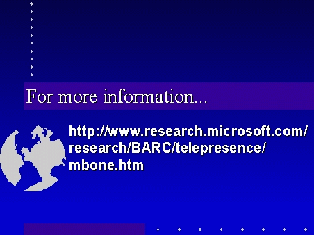 More info on MBONE and Windows at http://www.research.microsoft.com/research/BARC/telepresence/mbone.html