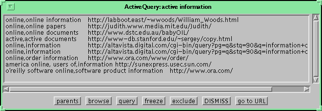 This is an example Active Query for "active information". The window shows a list of top-rated hits. Each line contains concepts on which the query matched, and URL location of the hit. The user may select a URL and press "go to URL" button to make the Navigator display the page with the hit. The page might have already been visited by the user or only proactively scanned by the Guide.