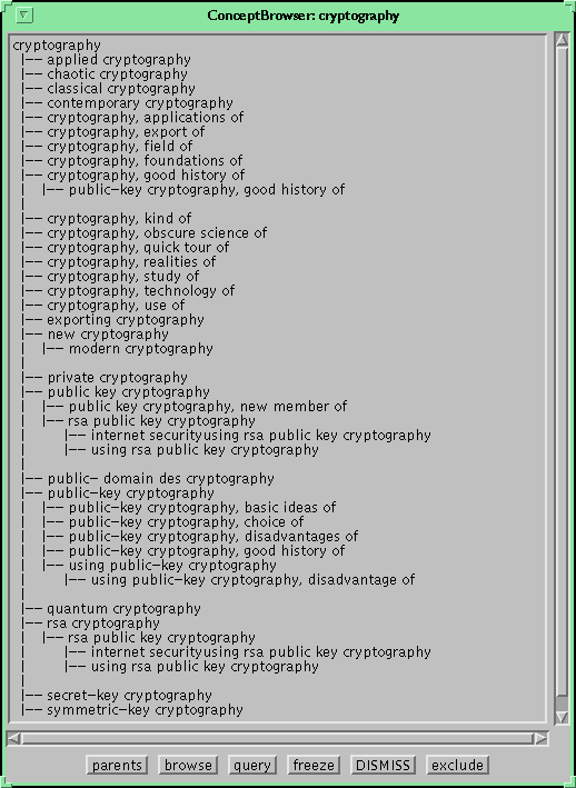 As an illustration, a user interested in the topic of "cryptography" accessed AltaVista using Netscape Navigator and the Browse Guide. The taxonomy displayed by the Concept Browser:
