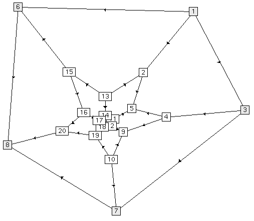 In Figure 4 we have also included a barycentric embedding of the icosahedron and dodecahedron, using cycles of length 3 and 5 respectively. In the case of the two leftmost embeddings, the outer cycle is fixed and the barycentric embedding has solved for the position of the remaining vertices. In the rightmost graph, however, we have used force-directed placement from the initial embedding in the center of Figure 4. This combination of methods gives excellent results, and is a good example of the power of interactive graph drawing. As we have emphasized earlier, the user can interact with the barycentric embedding in several different ways, e.g., by changing the length of the outer cycle and rotating the graph in three dimensions, the latter of which is in this case surprisingly helpful for visualization.