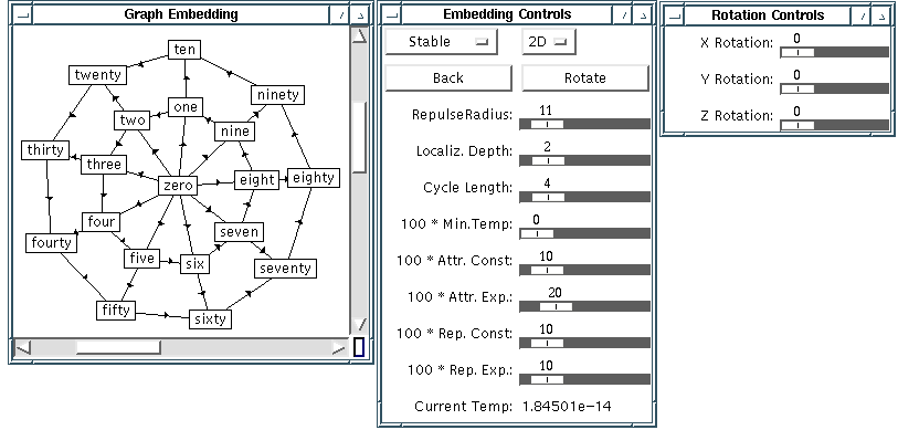 Once the system has been started, its interface consists of three windows: a main drawing panel displaying the graph, with scrollbars to allow panning; a general control window, containing controls allowing for the adjustment of various parameters, such as the embedding used; and a rotation control window. The windows of the interface can be seen in Figure 2. In the rest of this section we list the embeddings and the possible adjustments.