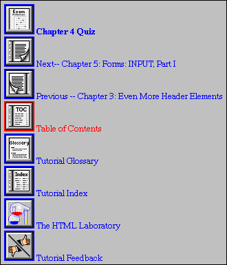 The quiz system for Introduction to HTML is actually based on three components: the HTML pages, the Perl scripts which evaluate the reader's input, and quiz keys. These keys are text files which contain the correct answers for the multiple-choice section, or the question text for the open exercises. These files allow me to alter the quiz responses quickly and easily.