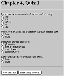 Further up the rung is a list of questions, with an e-mail address to which the answers can be mailed. The answers are then graded and returned to the reader. This approach will obviously not work in a setting other than a small, restricted pool of readers. As an example, my estimates show that such an e-mail system on a site such as my own Introduction to HTML[1] would generate over fifteen hundred messages per day! On the other hand, a class of twenty students taking five quizzes each over the course of a semester would work out to a little under two messages per day -- although they'd no doubt get bunched up around the due dates.