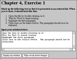 For the second part of the quiz, I was able to implement a number of 'open' exercises [Figure 5]. This was because my subject matter (HTML markup) lent itself to such exercises. By asking the reader to input HTML markup, and then displaying the results, I was able to let the reader test his knowledge in a 'hands-on' fashion, which is very important. In most cases, this will not work very well, although with certain subjects, a Java applet might allow for a similarly interactive application of newly-learned concepts.
