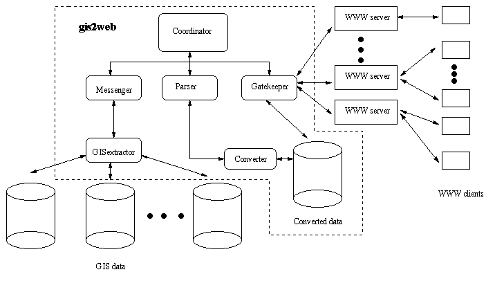 Gis2web consists of five different modules, as shown below in Figure 2 within the dotted box. The modules act as independent processes and communicate with each other using Internet protocols. The GISextractor accesses information on GIS servers. The Parser interprets the GIS information, creating the HTML format and storing it on the gis2web server. The Messenger passes the data between the GISextractor and the Parser. The Gatekeeper acts as an interface between gis2web and WWW servers, and the Coordinator schedules and controls the other modules. The following is a detailed description of each of the modules.