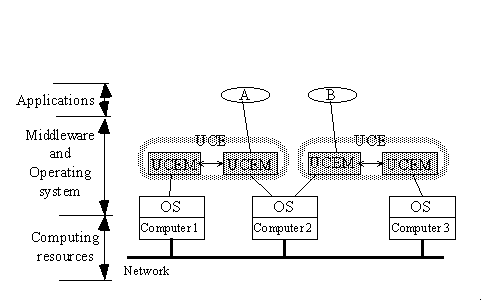 Our proposed middleware framework for wide-area and large-scale distributed systems is called the Unified Computing Environment (UCE for short). A UCE consists of a set of cooperating user-level daemons called UCE Manager (UCEM) running on multiple computers connected to a network: these UCEMs integrate the underlying computing resources (files, processors, etc.). Each set of UCEMs thus works like the distributed operating systems first explored in the mid 80's (for example, the V distributed system [5], Amoeba [15], Sprite [16], and Accent [17]). As shown in Fig. 1, the core features of the UCE are as follows.