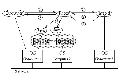 In Fig. 2, a browser user can use the processor pool consisting of computers 1 and 2 for Java applets. When the browser sends a request for a Web page to a Web server httpd, the request is first received by the proxy server, which transfers it to the specified Web server (step 1). The httpd returns the Web page to the proxy server (step 2). The proxy server examines the Web page (written in HTML) and if it contains Java applet tags, the server transforms them into tags that invoke a plug-in software module described later. The server then sends the modified Web page to the browser (step 3). The proxy server then requests the Java bytecodes specified in the Web page and receives them from the httpd (step 4). The proxy server then determines on which computers these bytecodes should be executed. This is done by referring to the information maintained by the UCEM. After determining the computers, the proxy server invokes the required Java execution environments (e.g., a Java interpreter like AppletViewer) on the selected computers and sends the Java bytecodes to the computers (step 5).
