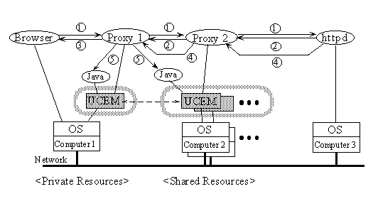 It is easy to utilize computers shared by many users. As shown in Fig. 3, a proxy server 2 is running on top of an UCE, forming the processor pool consisting of computer 2 (and more) shared by many users. A browser and its proxy server 1 are running on computer 1 which is the private resource of the browser user. When the browser sends a request, it is sent to the server httpd through the proxy server 1 and 2 (step 1). Because this makes the server 1 start communicating with the server 2, the two processor pools are temporarily merged to one consisting of computer 1, 2 and more. The httpd then returns the Web page to the proxy server 2 which transfers it to the server 1 without transformation (step 2). Subsequent steps 3 to 5 are followed as in Fig. 2 except that the proxy server 1 selects computers from the merged processor pool. Other users, whether each has his or her own resource or not, can utilize computer 2 and more by following the same steps.
