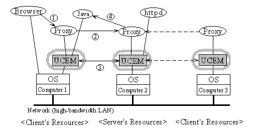 Our facility for providing processor pools for WWW- and Java-based applications is based on the UCE. As shown in Fig. 2, a proxy server runs on top of each UCE, and a Web browser (even a commercial browser with no modification) is configured to use the proxy server as its proxy. This proxy server acts as a regular HTTP proxy server, except that it transforms Web pages written in HTML into pages that make the browser communicate with Java programs running on remote computers.