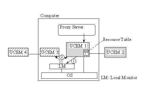 Because there may be multiple UCEMs that are not cooperating with each other running on the same computer, another daemon, called the Local Monitor (LM), runs on each computer, to provide the load information for that computer. This keeps the load information for all UCEMs running on that computer the same. When a UCEM knows that the load on the computer will change (because the UCEM has invoked a Java execution environment on the computer), it notifies the LM of the load change (step 1), and the LM multicasts it to all UCEMs running on the same computer (step 2).