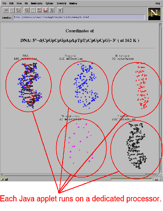 We have almost completed the UCEM and plug-in modules. The current prototype is being built on UNIX desktop workstations, with a cluster parallel machine as a processor pool. The prototype includes a set of UCEMs on these hardware platforms, a WWW proxy server that communicates with the UCEMs and distributes the Java applets, a small program that captures the visual output of the Java applets, and a Netscape plug-in module that accepts output from remote applets and displays it. Fig. 6 is a sample screen snapshot of our current prototype. The browser displays five Java applets, each of which runs on a different processor in the processor pool and computes a 3D image of a rotating DNA helix.