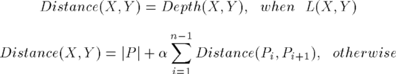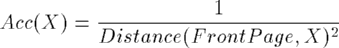 The farther an object is from the front page, the less accessible is it. Preliminary data shows an exponential falloff in accesses to a page as a function of its distance from the front page, and so we use the square of the distance. Let L(X,Y) be true when there exists a link from page X to page Y, Depth(X,Y) be the number of links above the link to Y on page X, and P be the set of pages P1 ... Pn along the minimal path from X to Y. We define the distance as: