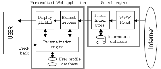 We think that many Web applications will, as a next step, adopt a personalization architecture (Fig. 1) and provide services that suit the interest of the user as an individual or as a member of a group. The Krakatoa Chronicle [4] is a prime example of what can be achieved when using the "content-based filtering" personalization technique. The layout of this electronic newspaper is personalized (the most interesting articles are displayed first) according to a user profile that reflects the user's interests. By scoring articles, the user provides a feedback that enables a learning engine to regularly update the user profile to reflect the changes of the user's interest. The popularity of other personalized Web applications such as Crayon [5], PowerStart [6], and PointCast Network [7] suggests that personalization techniques have a bright future.