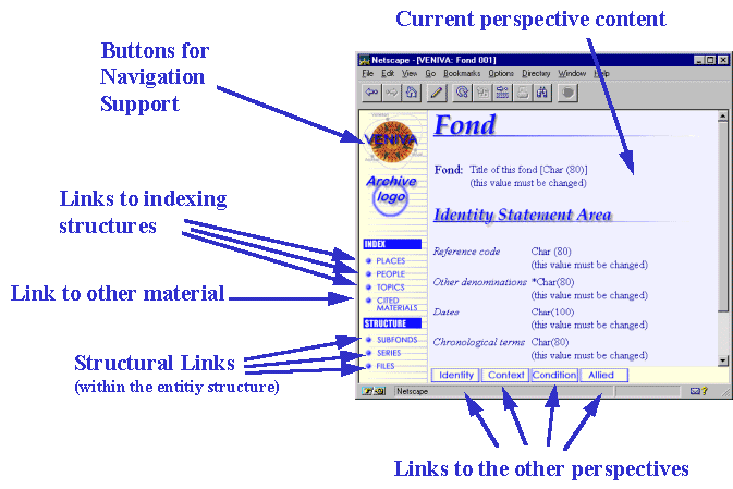 The content panel displays both the description of digital objects and the digital objects themselves. It is a seamless integration of meta-information and the actual information through the usage of hyperlink capabilities in the interface. At the bottom of the content panel, four buttons represent available perspectives on the information. This perspectives structure the descriptive information in four categories: Identity, Context, Condition, and Allied. Identity gives the information necessary to uniquely identify each individual object in the virtual archive. Context gathers the information on the historical context of the object. Condition talks about physical characteristics of the object and Allied points to related material in the archive.