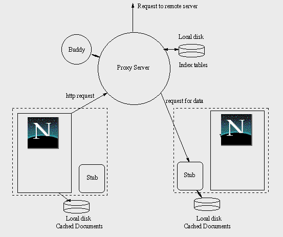 The WWW client has to be configured for the proxy connection. Any request sent by the client first goes to the proxy. The proxy looks up the cache index in order to locate the document within the subnet and on success returns the user id of the user who has cached the document, filename and date and time of last update. If located, two requests are sent :