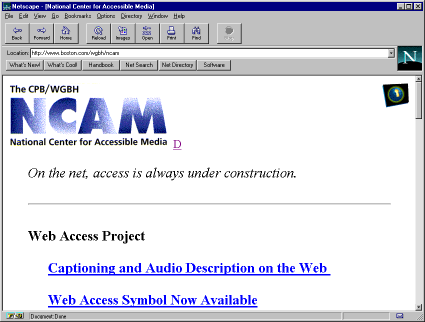 The National Center for Accessible Media (NCAM) in Boston, Massachusetts currently provides a service that implements descriptive video for the motion picture industry. Descriptive video and captioning are perfect examples of how the power of markup should be used to enhance the richness and accessibility of a document. They recently have grants to assist them in the research, design, and delivery of web-based information for public television.