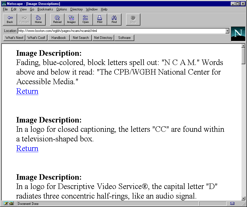 Image rendering provides similar problems. Because the blind or low vision user is likely to be using alternative output (access systems), certain design considerations should be implemented. For example, using meaningful descriptive text in conjunction with figures, images, or other graphical entities within a document. Descriptive or alternative text has become a standard for web based documents. In fact, some authoring tools like HotMeTaL Pro, HotDog Pro, and Corel Web.Designer have built-in prompts for alternate text. Ideally then browser providers should be able to properly display alternative text. The best implementation of alternate text display (are you listening Bill?) is Microsoft's Internet Explorer which automatically displays alternative text using bubble-help type notes as the user passes over the image with the mouse cursor. What will it take to get Netscape into the picture?